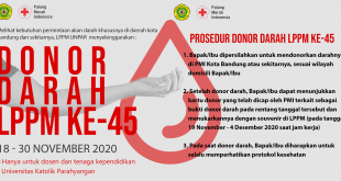 LPPM UNPAR mengadakan kegiatan Donor Darah yang ke-45 bekerjasama dengan Palang Merah Indonesia (PMI) kota Bandung. Dalam keadaan pandemi covid-19 ini, kegiatan Donor Darah hanya berlaku untuk Dosen dan Tenaga Kependidikan UNPAR dengan langsung datang ke PMI Kota Bandung atau sekitarnya. Kegiatan donor dilakukan mulai dari tanggal 18-30 November 2020 …