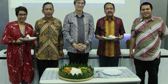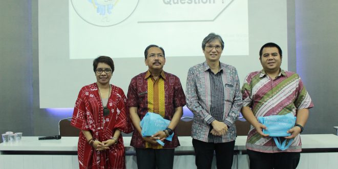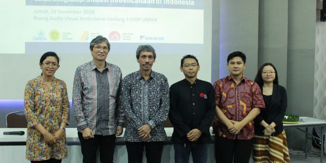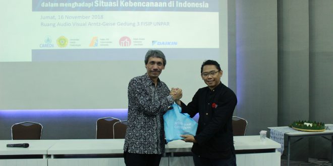 Pembicara B. Wisnu Widjaja dari Badan Nasional Penanggulangan Bencana (BNPB), Andreas Hapsoro dari HABITAT for Humanity Internasional-Asia Pacific, dan didampingi moderator, Dr. Orpha Jane, yang merupakan Wakil Rektor Bidang Keuangan dan Sumberdaya sekaligus anggota Pusat Studi CAREDs.