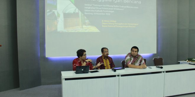 Dalam kesempatan tersebut dilaksanakan juga SEMINAR NASIONAL berjudul: “Tantangan dan Peluang Shelter Evakuasi Bencana dalam menghadapi Situasi Kebencanaan di Indonesia” yang terbagi atas 3 (tiga) sesi, dengan dihadiri oleh sekitar 80 peserta yang datang dari kalangan akademisi, mahasiswa, parktisi, dan tamu undangan baik dari UNPAR ataupun dari luar UNPAR.