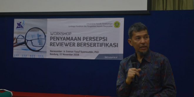 Pada hari Kamis (22/11/2018), Lembaga Penelitian dan Pengabdian kepada Masyarakat (LPPM) Universitas Katolik Parahyangan menyelenggarakan Workshop: “Penyamaan Persepsi Reviewer Bersertifikat”. Acara ini dilaksanakan di AULA, Lantai 1, Gedung Pascasarjana UNPAR, Jalan Merdeka No. 30, dan dibuka dengan sambutan dari Wakil Rektor Bidang Penelitian, Pengabdian kepada Masyarakat, dan Kerjasama UNPAR. Kegiatan ini terutama ditujukan bagi para reviewer UNPAR bersertifikat. Selain itu, LPPM UNPAR juga mengundang para reviewer bersertifikat di lingkungan LLDIKTI wilayah IV yang belum mengikuti persamaan persepsi reviewer. Beberapa reviewer yang turut hadir sebagai peserta diantaranya dari Universitas Kristen Maranatha, Universitas Telkom, Universitas Islam Nusantara, Universitas Pendidikan Indonesia, Universitas Advent Indonesia, dan Institut Teknologi Nasional.